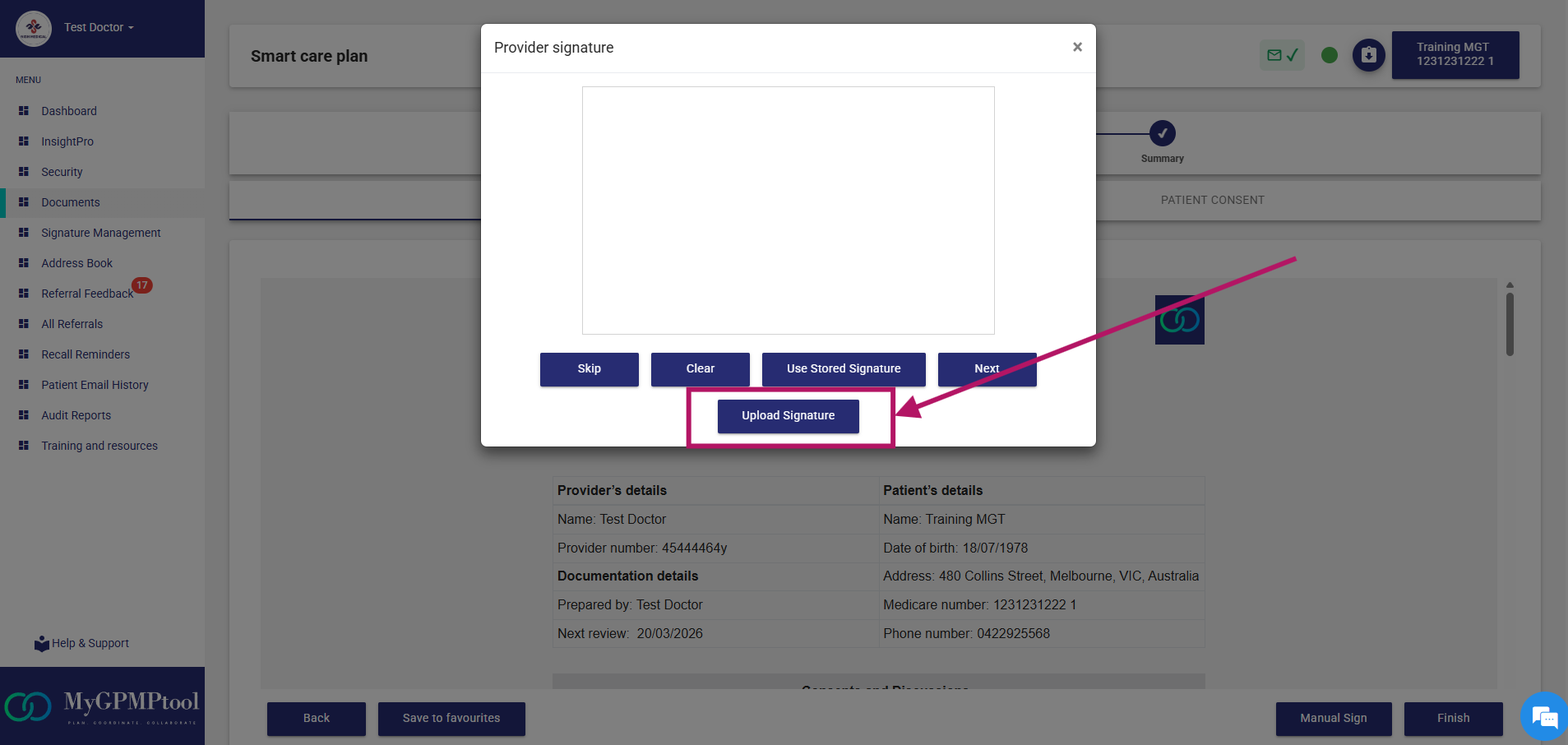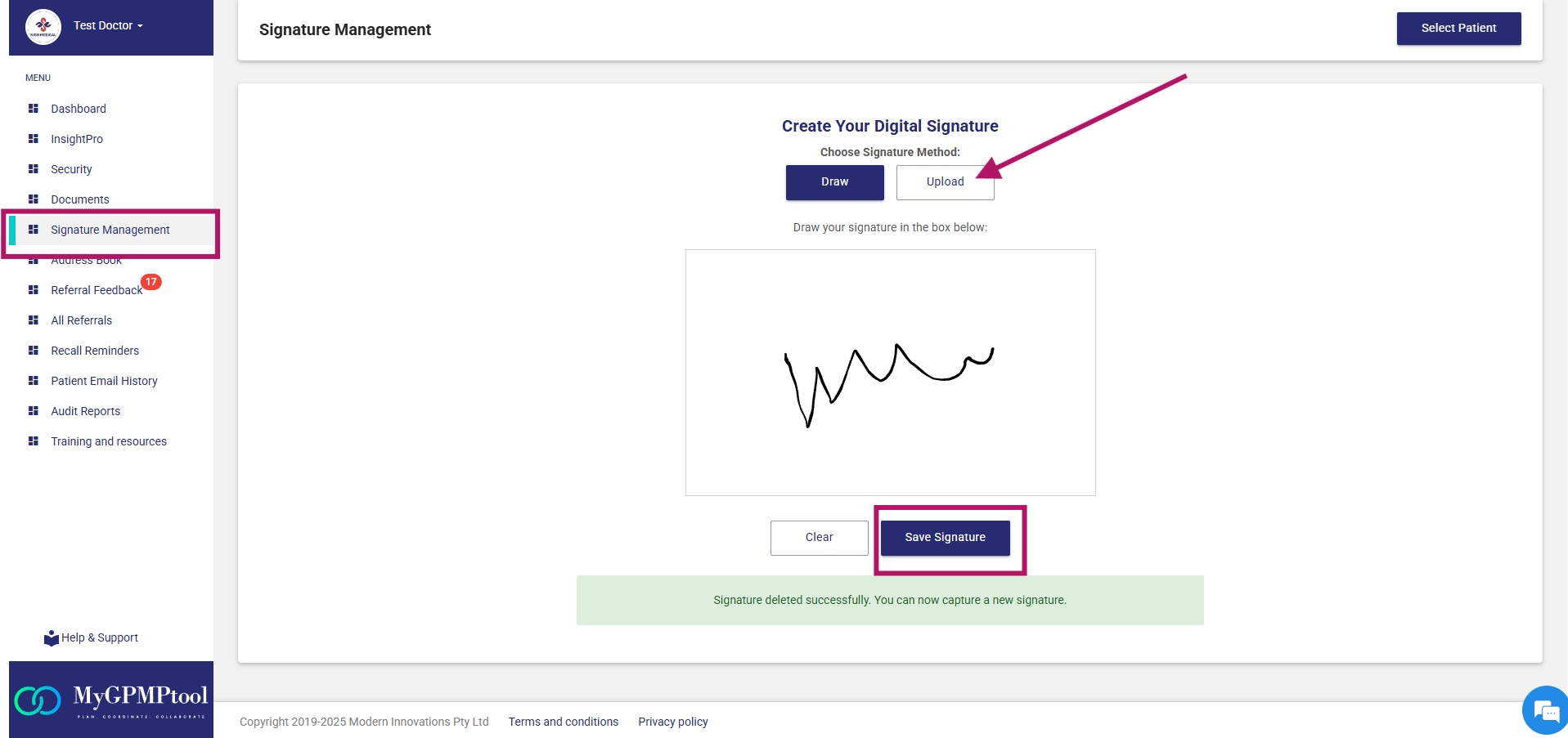 GPs can upload or draw and save their signature in MGT.